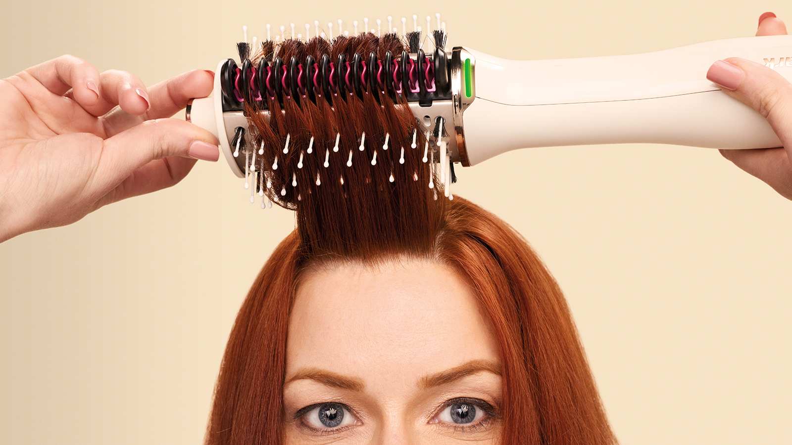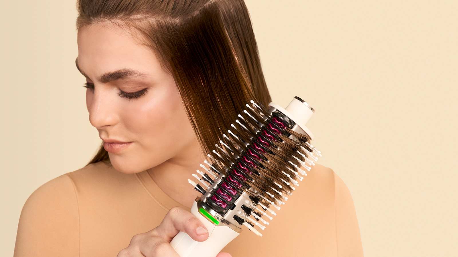 - En mode cheveux secs, faites pivoter manuellement la brosse à 360° pour que vos cheveux passent dans les deux peignes pour un lissage optimal.